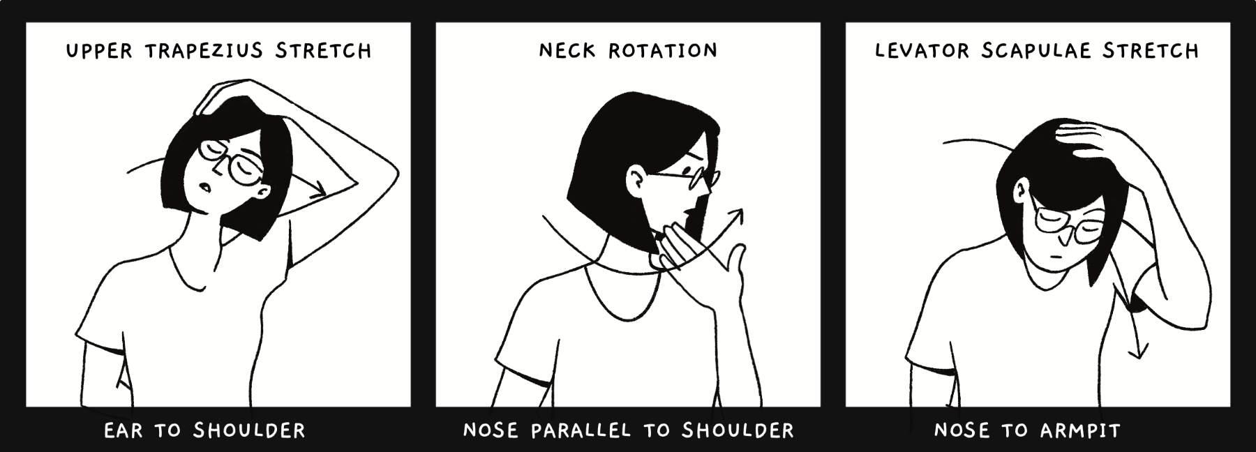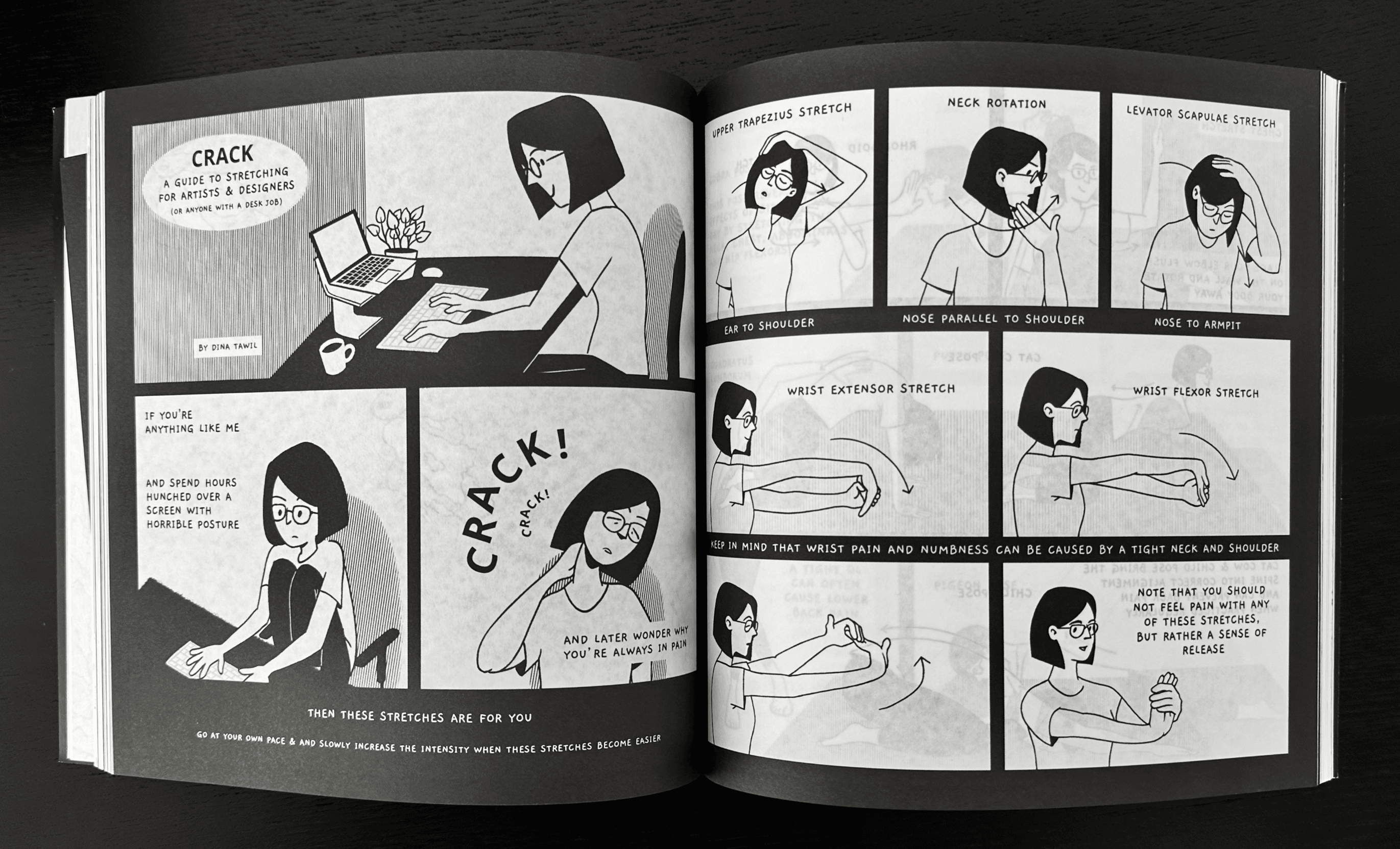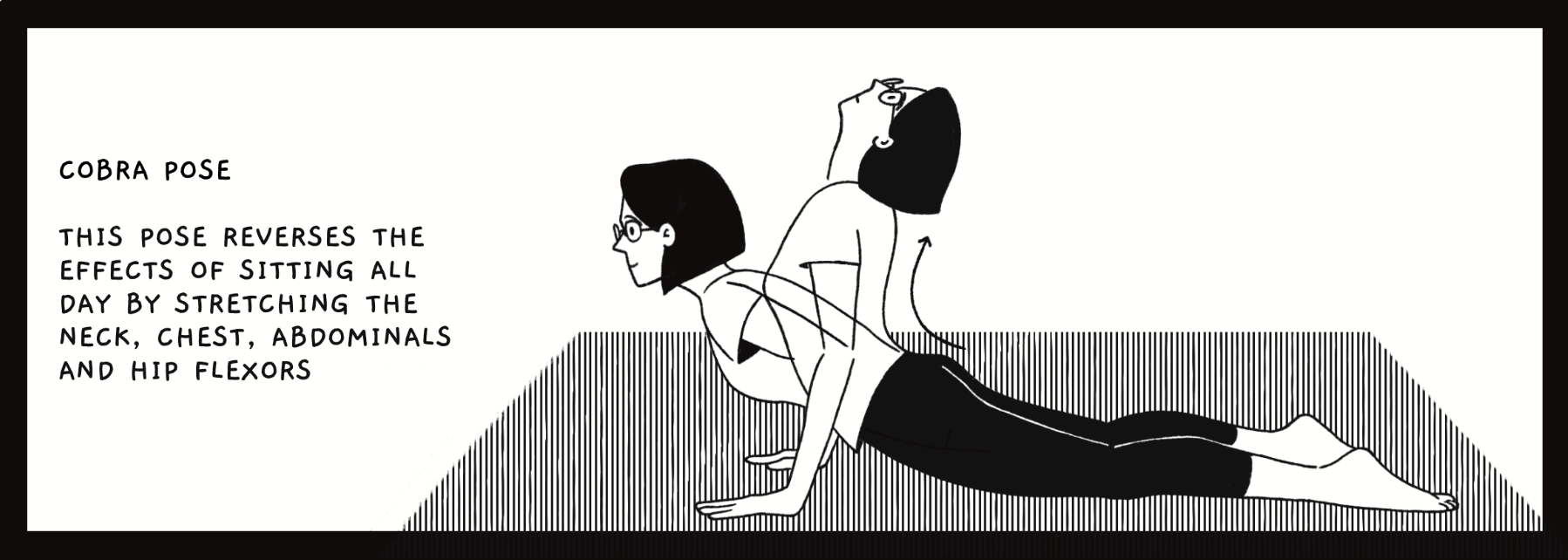 As artists, illustrators and comic artists, we spend a great part of the day hunched over our desks. After years of back problems and body aches, I've compiled a list of effective stretches and yoga poses that greatly alleviate the pain, all of which have been vetted by a physiotherapist.